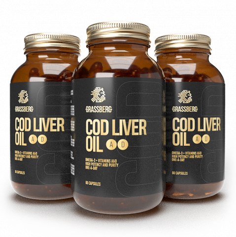 COD LIVER OIL GrassBerg – высококачественный жир из печени трески. Печень трески отличается высоким содержанием Омега-3 жирных кислот EPA и DHA, а также комплекс дополнен витаминами A, D и E.