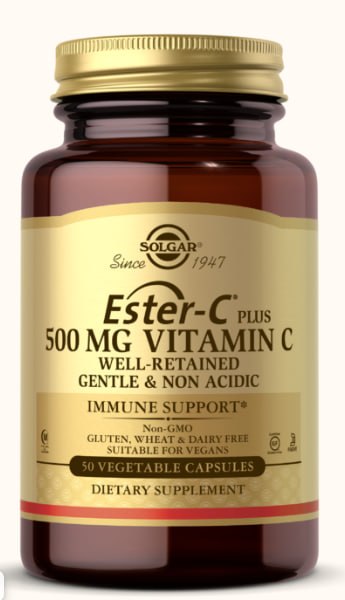 Ester-C Plus создан по эксклюзивной рецептуре Solgar и представляет собой запатентованный, pH-нейтральный (некислотный) и безвредный для ЖКТ сложный эфир витамина C. Метаболиты витамина С в эфире-С положительно влияют на удержание витамина С в клетках, обеспечивая дополнительную пользу. Для формирования уникального комплекса метаболита аскорбата кальция используется особый производственный процесс. Этот хорошо сохраняющийся комплекс также включает природные биофлавоноиды и ягод ацеролы наряду с плодами шиповника.