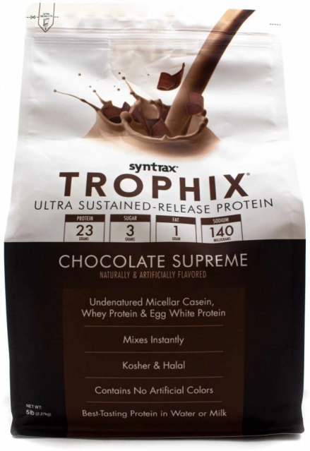 Syntrax Trophix - это долгоусвояемый комплексный протеин. Основным компонентом в Syntrax Trophix является молочный белок. Молочный белок белок долго усваивается, дает ощущение насыщения. Также в составе присуствуют сывороточный и яичный белки. Сыворотка быстро поднимает уровень аминокислот в крови, яичный и молочный белок поддерживают уровень аминокислот в крови на высоком уровне. Все компоненты, которые использованы в Syntrax Trophix легко усваиваются и обладают высокой биологической ценностью.